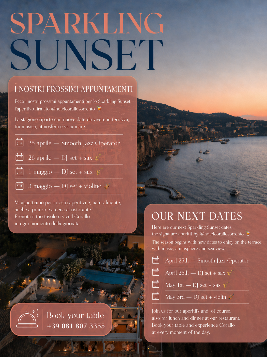 L’atmosfera di classe, l’elegante sala banchetti e la vista panoramica sull’intero Golfo: l’Hotel Corallo Sorrento è perfetto per ospitare eventi esclusivi.